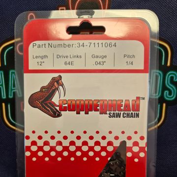 Copperhead 12 in. Saw Chain (64E, .043 gauge, 1/4 LP) is a precision replacement chain designed for smooth, controlled cutting on compatible small chainsaws. Its low-profile design delivers clean cuts with reduced vibration and reliable performance. Ideal for homeowners and professionals maintaining lightweight saws and pruning equipment.