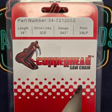 Copperhead 14 in. Saw Chain (52E, .043 gauge, 3/8 LP) is a durable replacement chain designed for smooth, efficient cutting on compatible chainsaws. Its low-profile design helps deliver clean cuts with reliable performance and reduced vibration. Ideal for homeowners and professionals maintaining lightweight and mid-duty chainsaws.