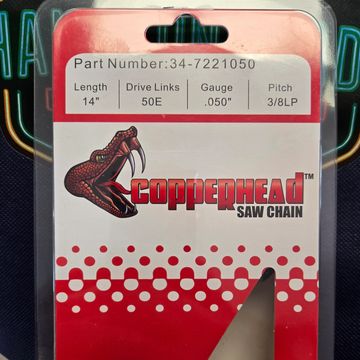 Copperhead 14 in. Saw Chain (50E, .043 gauge, 3/8 LP) is a reliable replacement chain built for smooth, efficient cutting on compatible chainsaws. Its low-profile design helps deliver clean cuts with reduced vibration and dependable performance. Ideal for homeowners and professionals using lightweight to mid-duty chainsaws.