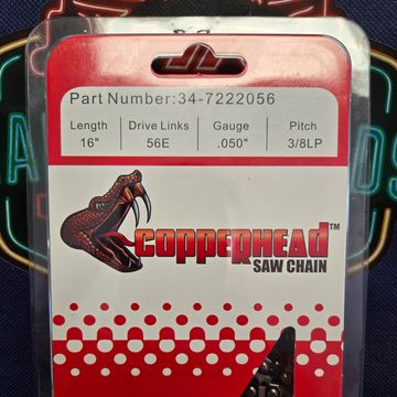 Copperhead 16 in. Saw Chain (56E, .050 gauge, 3/8 LP) is a durable replacement chain designed for smooth, efficient cutting on compatible chainsaws. Its low-profile design helps deliver clean cuts with reduced vibration and dependable performance. Ideal for homeowners and professionals using lightweight to mid-duty chainsaws.