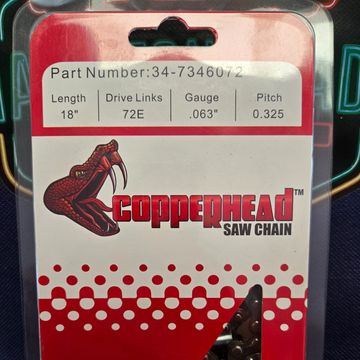 Copperhead 18 in. Saw Chain (72E, .063 gauge, .325 pitch) is a heavy-duty replacement chain built for powerful, efficient cutting on compatible chainsaws. Designed for durability and smooth operation, it delivers clean cuts and reliable performance for firewood, storm cleanup, and property maintenance—ideal for homeowners and professionals.