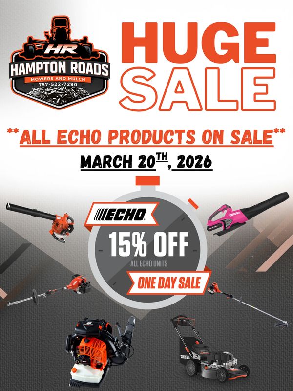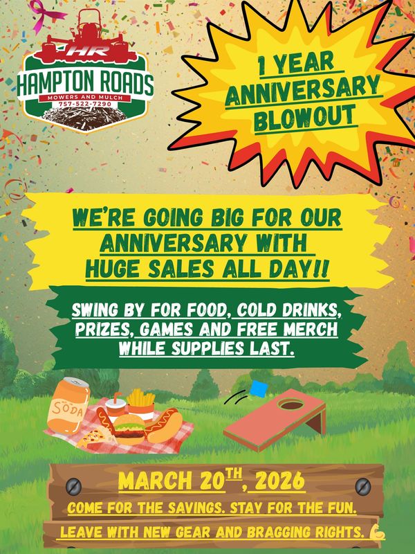 We’re celebrating Hampton Roads Mowers & Mulch’s 1-Year Anniversary with a full-day Party & Sale featuring huge discounts, food, drinks, prizes, games, and free merch while supplies last!